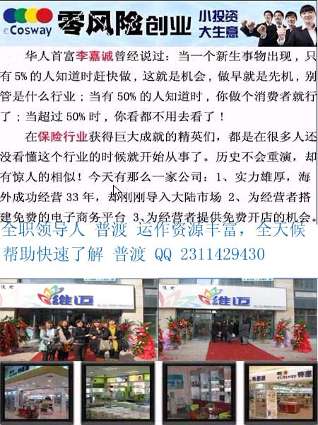 ecoswaye科士威科士威財(cái)務(wù)自由至尊系統(tǒng)恒信團(tuán)隊(duì)普渡河南鄭州15928855671QQ:23114294301、免投資、無(wú)風(fēng)險(xiǎn)不需要投資龐大的資金、根本不必承擔(dān)所謂的投資風(fēng)險(xiǎn),更沒(méi)有經(jīng)營(yíng)事業(yè)的諸多壓力。因?yàn)?,透過(guò)e科士威的規(guī)劃運(yùn)作,以及完善可靠的創(chuàng)業(yè)道路,遵循前人積累的智慧軌跡,再加上自己的勤奮努力,就能創(chuàng)造一個(gè)真正屬于自己的事業(yè)。2、無(wú)條件限制沒(méi)有傳統(tǒng)就業(yè)市場(chǎng)存在的諸多難以跨越的門檻,也沒(méi)有