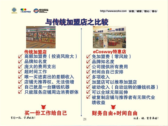 1、ecosway是什么?QQ584268603e科士威是電子商務(wù),像淘寶等網(wǎng)上購物,而又優(yōu)于淘寶,因?yàn)樗С秩蛘涞礁晒敬姘l(fā)貨。又和沃爾馬大型超市有點(diǎn)近似,產(chǎn)品種類繁多,有實(shí)體折扣店鋪,物美價廉。又和安利、玫琳凱等直銷的模式相似,因?yàn)樗Y(jié)合了直銷的一個獎金制度??剖客且粋€全新的互惠營銷商業(yè)模式,把消費(fèi)者、銀行、商家及業(yè)主(經(jīng)營者)有效的整合在一起,讓每個經(jīng)營者和消費(fèi)者都能輕松的參與到