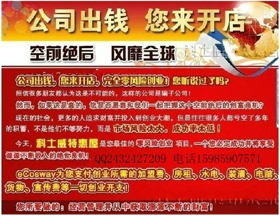 一個轟動全球的商業(yè)模式,在家創(chuàng)業(yè),零投資無風(fēng)險、換一個品牌消費就能換一個人生!花您本來就該花的錢,賺您本來賺不到的錢!低門檻、零投入!兼職、創(chuàng)業(yè)均可!一臺電腦就可以做全球市場!無需推銷,無需囤貨,無需好口才!一個人人可為的事業(yè)機會。我們會告訴您如何足不出戶,打造您的網(wǎng)上“沃爾瑪”,網(wǎng)絡(luò)地面同時經(jīng)營,擁有一家經(jīng)營幾千款世界知名品牌的網(wǎng)上超市嗎?類別包括家居日用、美容護膚、營養(yǎng)保健、香水彩妝、汽車保養(yǎng)