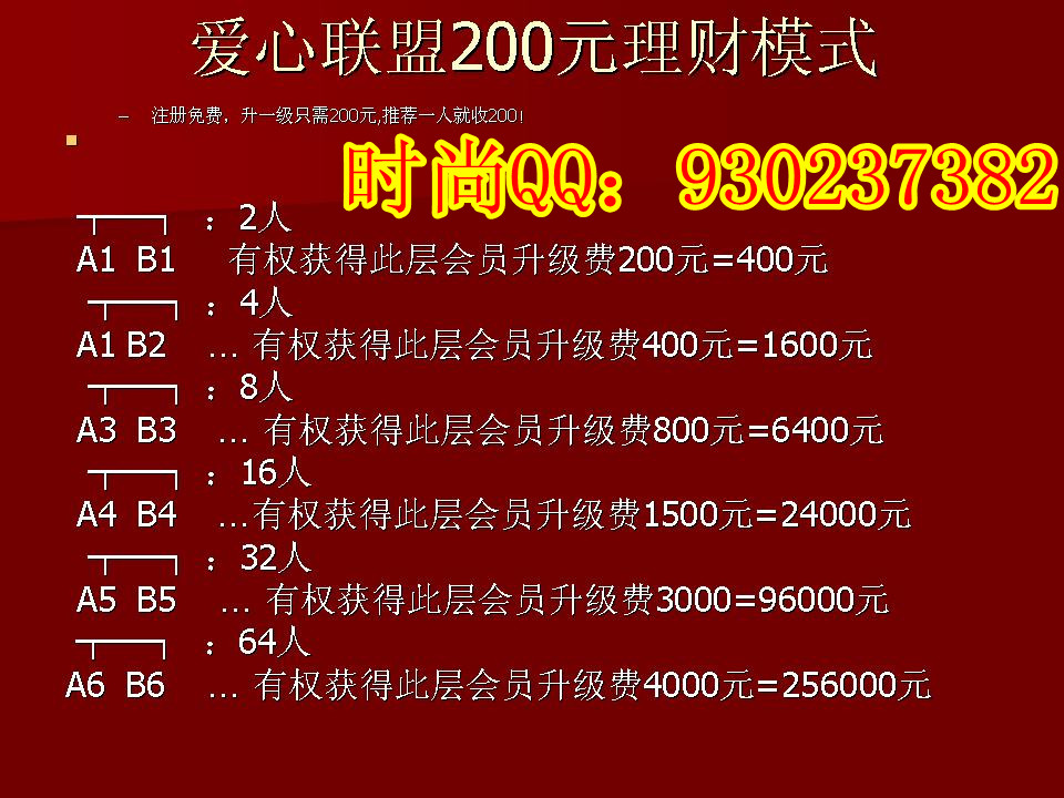 ★★保持您的100%利潤★★不需要等待公司支付★★直接向您付款★★2x6強制矩陣★★只需要200元來啟動,所有人都能承擔得起★★沒有每月的服務費也沒有管理費★★您也為所需要幫助的人,獻出您的愛心《愛心聯(lián)盟創(chuàng)業(yè)規(guī)則》創(chuàng)業(yè)咨詢qq930237382游戲的具體規(guī)則如下:1.凡年滿18歲的公民,自愿繳納200元的創(chuàng)業(yè)金,即可成為愛心聯(lián)盟創(chuàng)業(yè)團隊的正式會員,享有愛心聯(lián)盟會員的一切權利和義務。一旦確認為愛心聯(lián)