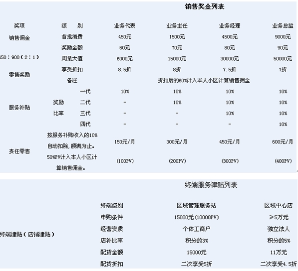 注:1、銷售傭金是指A、B兩區(qū)按2:1或1:2的要求計(jì)算;2、直接推薦的會(huì)員可享受不同級(jí)別的差額;3、服務(wù)補(bǔ)貼是指根據(jù)本人直接推薦的會(huì)員所產(chǎn)生的銷售傭金的10%來(lái)計(jì)算;業(yè)務(wù)代表享受1代、業(yè)務(wù)主任享受2代、業(yè)務(wù)經(jīng)理享受3代、業(yè)務(wù)總監(jiān)享受4代;4、①終端津貼是區(qū)域中心店享受區(qū)域內(nèi)所有管理服務(wù)站2%的差額獎(jiǎng);②區(qū)域中心店進(jìn)貨可享受4.5折,并享受業(yè)務(wù)總監(jiān)待遇,二次進(jìn)貨單次進(jìn)貨不低于3000元20%轉(zhuǎn)換積