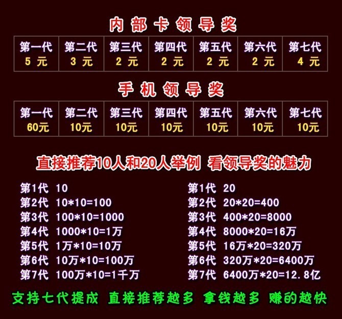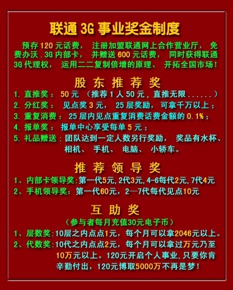 聯(lián)通3G創(chuàng)業(yè)導(dǎo)師-聯(lián)通3G=松山老師QQ274530566真誠(chéng)分享:聯(lián)通3G卡項(xiàng)目推廣,120元注冊(cè)辦理,采用幾何倍增原理,二二復(fù)制。最新版獎(jiǎng)金公布:一、層數(shù)獎(jiǎng)【股東會(huì)員獎(jiǎng)】1、直接推薦獎(jiǎng)——推薦1個(gè)用戶獎(jiǎng)勵(lì)50元(推薦多少不封頂,多勞多得)2、團(tuán)隊(duì)分紅獎(jiǎng)——見(jiàn)點(diǎn)分紅3元(自己傘下團(tuán)隊(duì)每產(chǎn)生一個(gè)用戶分紅獎(jiǎng)勵(lì)3元)3、報(bào)單商務(wù)中心獎(jiǎng)——商務(wù)中心每激活1單獎(jiǎng)勵(lì)5元4、重復(fù)消費(fèi)獎(jiǎng)——傘下伙伴每充值話費(fèi)1
