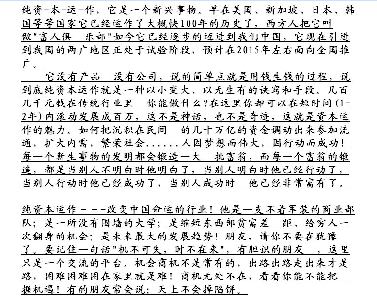 〈〈網(wǎng)絡(luò)資本運(yùn)作〉``````````朋友您好?應(yīng)該是了解過異地的資本運(yùn)作來了解網(wǎng)資,`````我是從事了一年的異地資本運(yùn)作生涯的異地````````經(jīng)理走到今天也義無返顧加入網(wǎng)資,`````從中得到的網(wǎng)資經(jīng)驗(yàn)和朋友共同探討與分享希望對您有所幫助!由于文字有限詳談獎(jiǎng)金分配是怎么樣的?答:獎(jiǎng)金分配是公開公平公正,電腦分配獎(jiǎng)金不會(huì)多也不會(huì)少。那磨我們都知道,網(wǎng)資賺錢做的就是上金分紅和推薦獎(jiǎng)對不?上金越