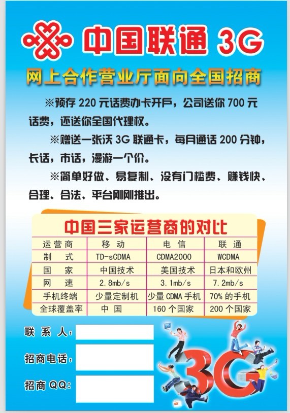 G火爆!商機(jī)!創(chuàng)業(yè)!賺錢!中國聯(lián)通3G事業(yè)向全國免費(fèi)招網(wǎng)上營業(yè)廳代理商。免費(fèi)擁有創(chuàng)業(yè)平臺(tái),免費(fèi)開網(wǎng)上聯(lián)通3G營業(yè)廳的機(jī)會(huì)來了。★★聯(lián)通3G新商機(jī)★★★一、什么項(xiàng)目?1、中國聯(lián)3G沃186號(hào)段的推廣,傳統(tǒng)是交話費(fèi)送贈(zèng)品,★現(xiàn)在是存話費(fèi)送創(chuàng)業(yè)機(jī)會(huì)。存話費(fèi)送網(wǎng)上營業(yè)廳平臺(tái)經(jīng)營權(quán)。預(yù)存220元送460話費(fèi),★送網(wǎng)上聯(lián)通合作營業(yè)廳平臺(tái)經(jīng)營權(quán),★送聯(lián)通3G卡。二、如何來做?★自己只需辦理一張:3G186卡;預(yù)
