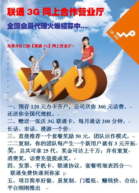 一:聯(lián)通3G事業(yè)是一個白手起家沒有風險的事業(yè)。我們投資多少,公司送給我們3倍話費,沒有風險。 二:聯(lián)通3G事業(yè)是個擁有充分自由的事業(yè)。自己就是老板,做多大、何時做完全自己說了算??扇毧杉媛?,出差、旅游、娛樂、吃飯時都可以做 三聯(lián)通3G是個助人助已的事業(yè)。加入聯(lián)通3G,一定要幫朋友成功,當你朋友成功的時候你自然就成功了?! ∷模郝?lián)通3G是個成功機率最大的事業(yè)。中國是全世界手機擁有量最大