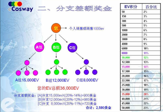 分支差額獎,就是您的業(yè)績跟您下面部門業(yè)績之間的差額獎金。如上圖,您的總業(yè)績是36000ev, 那就用3600ev的百分比20%減去A部門15000ev的百分比14% : 20%-14%=6% ,那A部門的業(yè)績15000 X 6%=900美金 這是A組您所得的差額獎金,于此相同B 、C部門的業(yè)績也是這么算! 這三個部門的差額獎金都可以領(lǐng)取。