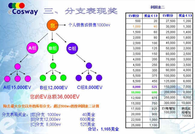 分支表現(xiàn)獎,表現(xiàn)表現(xiàn),也就您把你的部門整體帶領(lǐng)得如何。除去一個最大的部門業(yè)績(合格分支),剩下的部門業(yè)績、個人業(yè)績對照業(yè)績表領(lǐng)取。如上圖,A部門業(yè)績最大,作為合格分支,不算獎金。您個人業(yè)績1000ev對照表可領(lǐng)取40美金,B部門對照領(lǐng)取600美金,C部門對照領(lǐng)取525美金。