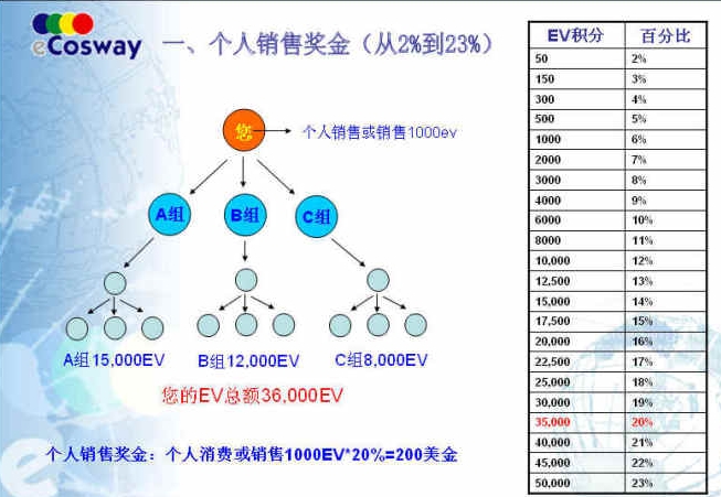 科士威獎金制度一共有四種獎金:個人銷售獎金、分支差額獎、分支表現(xiàn)獎、額外分支獎