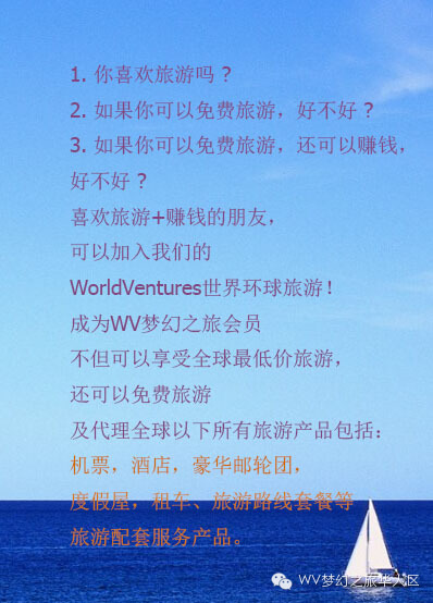 有興趣尋找各地區(qū)團隊加盟請咨詢介紹給你的朋友,微信(QQ)417611023。WV夢幻之旅俱樂部_中國官方網(wǎng)站_愛游系統(tǒng)_團隊讓您輕松在家創(chuàng)業(yè) http://wvgfw.com/ay/417611023/