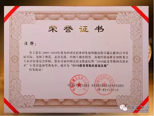 2013年11月,汪靜董事長(zhǎng)獲最受尊敬的直銷總裁獎(jiǎng),由中國(guó)直銷文化論壇、最受尊敬的直銷企業(yè)年度評(píng)選委員會(huì)頒發(fā)。
