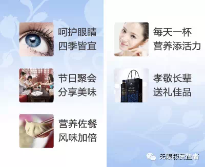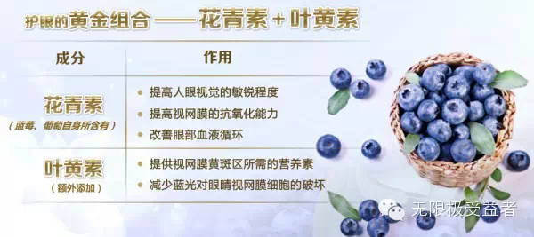獨特成分:無限極藍莓復合果汁飲料含有眼睛黃斑區(qū)所需的“視黃金”——葉黃素。