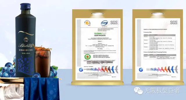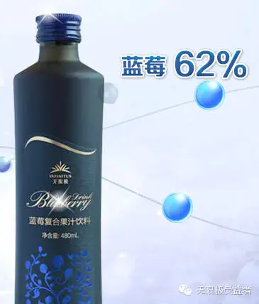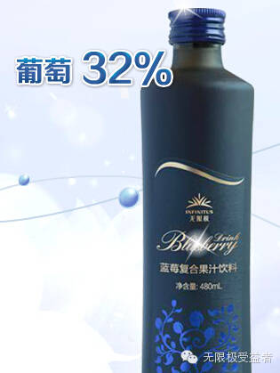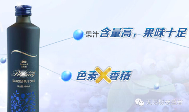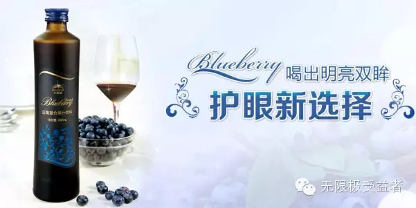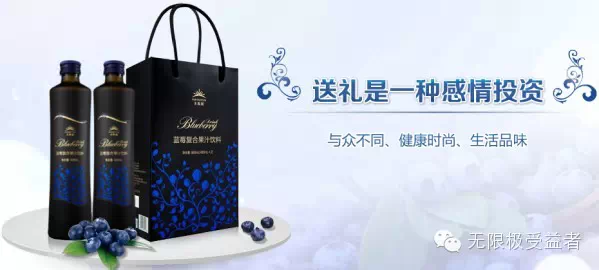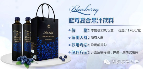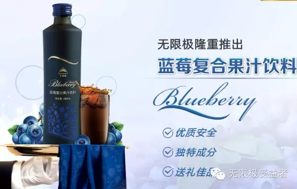 無限極藍莓復合果汁飲料是以藍莓濃縮汁為主要原料,科學添加葡萄濃 縮汁、葉黃素、枸杞子提取物等成分的高檔飲料,天然安全,適合廣大消費者日常飲用。