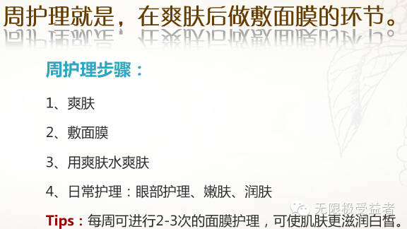 周護理的步驟是爽膚后再敷面膜,然后在用爽膚水做護膚的步驟,接著的步驟就是跟日常護理一樣的。