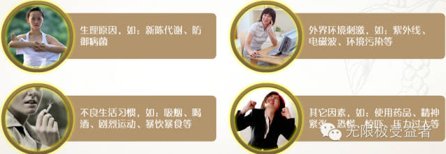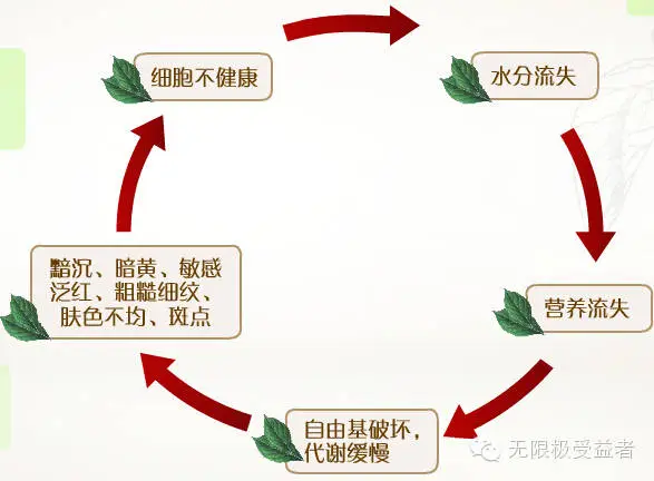 首先,自由基會攻擊細胞膜,使細胞水分流失時,進而導致營養(yǎng)流失,這時候自由基還會趁虛而入破壞完整的細胞鏈,使得肌膚新陳代謝變的緩慢,皮膚接著就會變的黯沉、暗黃、敏感泛紅、粗燥細紋、膚色不均、甚至會出現(xiàn)斑點等。