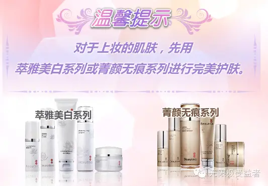 溫馨提示:對(duì)于上妝的肌膚,需要先用萃雅美白系類或菁顏無痕系類進(jìn)行完美護(hù)膚,只有足夠軟化的面部肌膚,才能與粉底完美結(jié)合呈現(xiàn)自然無暇的肌膚。