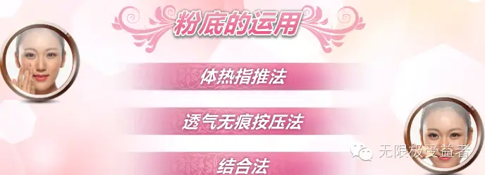 粉底的運(yùn)用方法一般有三種:體熱指推法、透氣無痕按壓法、結(jié)合法。