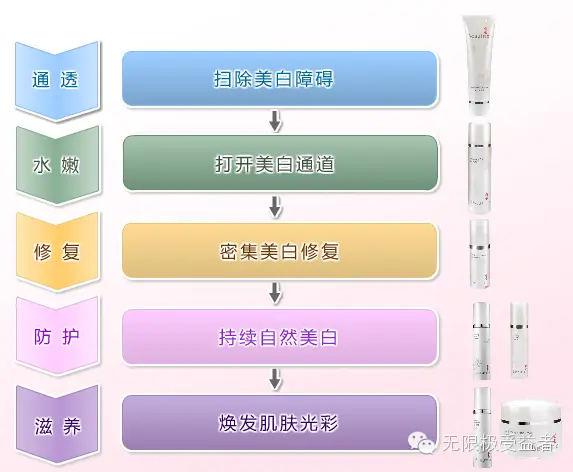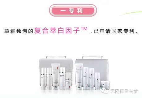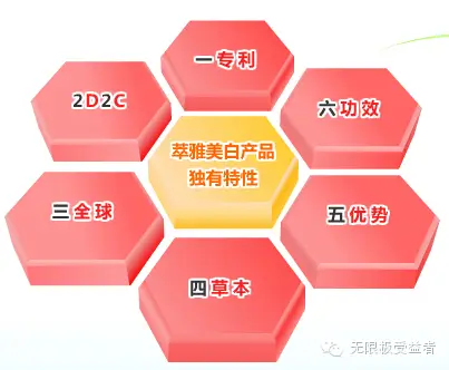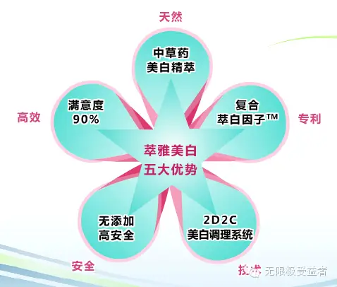 萃雅美白產(chǎn)品獨有特性:六大功效、五大優(yōu)勢、四種草本、三全球、2D2C調(diào)理系統(tǒng)、一項專利。