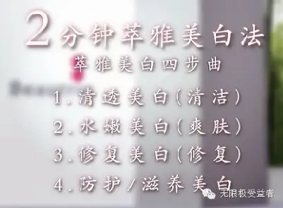 “2分鐘萃雅美白法”包括清透美白(清潔)、水嫩美白(爽膚)、修復美白(修復)、早上的防護美白或晚上的滋養(yǎng)美白四部曲。