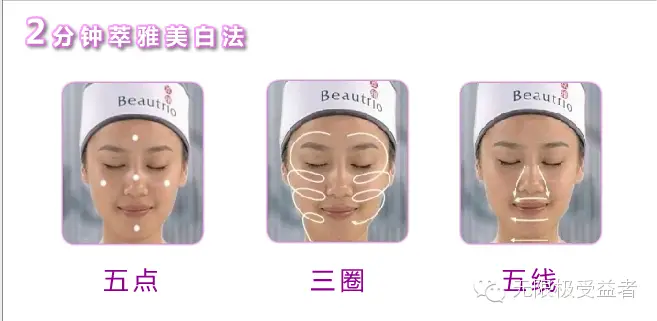 “2分鐘萃雅美白法”揉合了歐洲時尚高雅、輕松舒緩的護膚手法和傳統(tǒng)中醫(yī)養(yǎng)顏理念,采用五點、三圈、五線方式,還可以得到護膚帶來的極致美好享受。