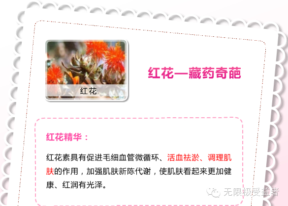 紅花素有促進毛細血管微循環(huán)、活血祛瘀、調(diào)理肌膚的作用,加強肌膚新陳代謝,使肌膚看起來更佳健康、紅潤有光澤。