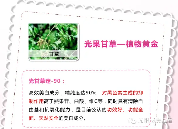高效美白成份,精純度達90%,對黑色素生成的抑制作用高于熊果苷、曲酸、維C等,同時具有具有清除自由基和抗氧化能力,是目前公認的功效好、功能全面、天然安全的美白成份。