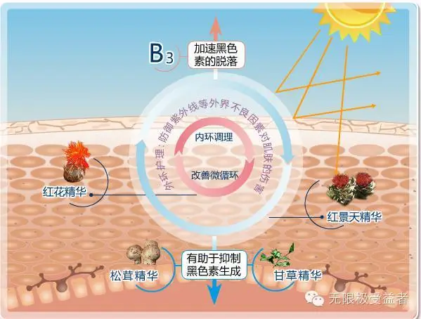 對黑色素形成的酶體系有調(diào)節(jié)作用,調(diào)節(jié)黑色素生成過程、促進假黑素產(chǎn)生、抑制真黑素合成,既達到安全美白肌膚共享,又不影響肌膚的紫外線防御能力。