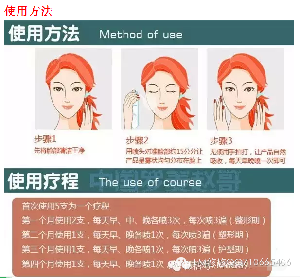 清潔臉部肌膚后,距離臉部15厘米左右,自下往上呈霧狀均勻地噴在臉部,噴后無須用手拍打臉部,讓產(chǎn)品自然吸收,待皮膚完全吸收干后繼續(xù)噴第二遍或第三遍。(購買首套產(chǎn)品每日早中晚按指導(dǎo)說明使用)