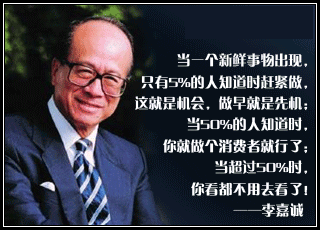 李嘉誠說:當(dāng)一個(gè)新生事物出來的時(shí)候,所有人反對(duì),您要堅(jiān)定的做,當(dāng)95%的人反對(duì)的時(shí)候,您要趕緊做;當(dāng)50%的人認(rèn)同的時(shí)候,您就做一個(gè)消費(fèi)者就好了!翻譯一下:李嘉誠說當(dāng)一個(gè)新生事物出來的時(shí)候,所有人用眼睛看,您要用眼光看!但所有人都能看懂,您就要改行了!所以,一般來說,打工不需要眼光,所以,打工永遠(yuǎn)是多數(shù)人;做生意,尤其是把握機(jī)會(huì),需要眼光,所以,富人永遠(yuǎn)是少數(shù)人!