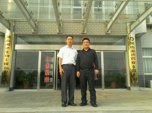 本報(bào)記者康崢雄(左)與湖南海濟(jì)藥業(yè)有限公司總經(jīng)理周偉(右)合影。