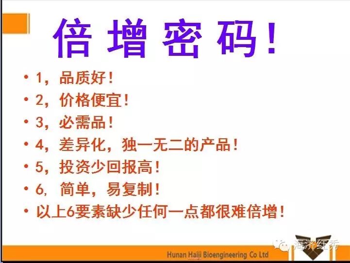 3,市場倍增快:這個行業(yè),想要倍增快,要有幾個條件,一要簡單易學易教易復制,二要容易成交,三要無風險。湖南海濟的制度都符合。