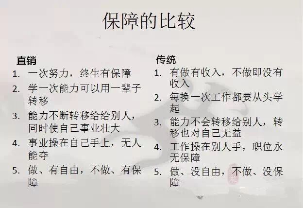 直銷工作:自己做主,永遠(yuǎn)不會被淘汰一次成功永久受益,可以世襲。