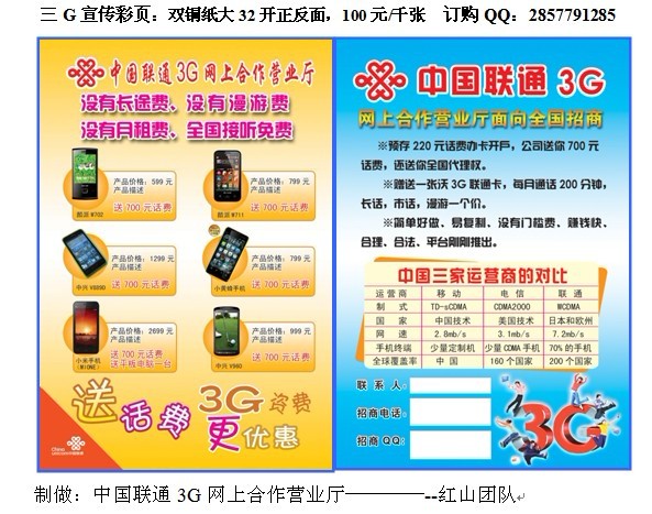 1、中國聯(lián)3G 沃 186號段的推廣,傳統(tǒng)是交話費送贈品,★ 現(xiàn)在是存話費送創(chuàng)業(yè)機會。存話費送網(wǎng)上營業(yè)廳平臺經(jīng)營權(quán)。預(yù)存220元送460話費,★ 送網(wǎng)上聯(lián)通合作營業(yè)廳平臺經(jīng)營權(quán),★ 送聯(lián)通3G卡。