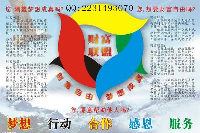財(cái)富聯(lián)盟:全球聯(lián)盟——互聯(lián)網(wǎng)零成本零風(fēng)險(xiǎn)在家創(chuàng)業(yè)聯(lián)盟(五大文化:夢(mèng)想、行動(dòng)、合作、感恩、服務(wù))宗旨:尋找和幫助不愿意東奔西跑勞苦奔波受盡風(fēng)吹雨打嚴(yán)寒酷署煎熬,而希望在家創(chuàng)業(yè)以小博大一根網(wǎng)線一臺(tái)電腦一杯咖啡一件睡衣,就可以輕松借助互聯(lián)網(wǎng)零成本在家創(chuàng)業(yè),服務(wù)全球消費(fèi)者的順應(yīng)時(shí)代趨勢(shì)大成功的有志之士、尋找本身已有工作但想兼職在互聯(lián)網(wǎng)零成本在家創(chuàng)業(yè)修筑財(cái)富管道的有志之士、尋找不方便外出上班辛苦打工必須在家照顧親人孩子的家庭主婦和模范煮夫借助互聯(lián)網(wǎng)零成本在家創(chuàng)業(yè)以及年老體弱不方便外出的退休養(yǎng)老之人……