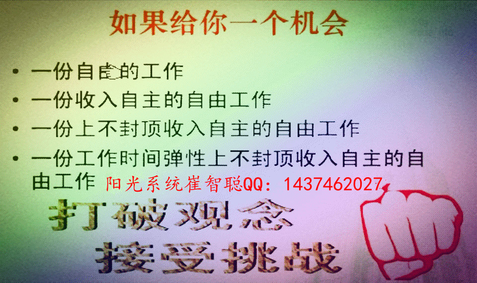 朋友,你好,恭喜您打開這封信。因為據(jù)統(tǒng)計,只要認真讀完這篇信的朋友,他的生活和收入很快將發(fā)生了改變。而且,這種改變的速度在加快。我叫李厚江,來自山東青島,隆力奇陽光國際高級講師,在傳統(tǒng)行業(yè)奮斗十幾年,通過自己的不斷努力從一線員工職位不斷提升,做到高級經(jīng)理的職位。接觸隆力奇以后,毅然投身了隆力奇電子商務(wù),相信憑借自己的實力和經(jīng)驗一定能夠做出更大的成績,帶領(lǐng)更多的伙伴走上隆力奇的巔峰!商務(wù)QQ1580981283,全球招商電話:18669880308,請您花上幾分鐘的時間看完,我相信一定會給您帶來一些驚喜與新的機會。專業(yè)網(wǎng)商教練李厚江老師天天在線指導(dǎo)。會吃苦,吃一時的苦,不會吃苦,會吃一輩子的苦;人生不怕重新來過,最怕一輩子重新來過。我不反對上班,但反對一輩子上班!我不反對奮斗,但反對一輩子奮斗!相信自己,給自己一次創(chuàng)業(yè)的機會!當然有不勞而獲的事,有信心加入創(chuàng)業(yè)行列的人才能成功!一個改變我們一生命運的模式,你的人生將從此與眾不同!選擇大于努力,了解勝于錯過!你可以不信,你可以拒絕,但不可不看,看看你就一定不會后悔!一臺電腦,一根網(wǎng)線,足不出戶,品著咖啡,穿著睡衣,輕松自由網(wǎng)上創(chuàng)業(yè)。目前,中國只有31家企業(yè)獲得直銷牌照,幾乎處于相對壟斷的市場局勢。所以,直銷在中國是真正意義上的一個先機事業(yè)。歡迎咨詢隆力奇陽光國際住家創(chuàng)業(yè)導(dǎo)師【李厚江老師】QQ1580981283全球招商電話18669880308陽光網(wǎng)商國際系統(tǒng)唐秀瓊真誠與您交流===QQ1954235101陽光網(wǎng)商國際系統(tǒng)褚高峰真誠與您交流===QQ854023768陽光網(wǎng)商國際系統(tǒng)李春鳳真誠與您交流===QQ1547203922陽光網(wǎng)商國際系統(tǒng)寒雪真誠與您交流===QQ289233534【隆力奇陽光網(wǎng)商國際系統(tǒng)全球招商網(wǎng)站】http://www.taihesun.com/opp/lihoujiang【我的博客】http://www.solarphp.org.cn/blog/bid1010/【新浪博客】http://blog.sina.com.cn/u/2057547645【我的會客廳】http://www.solarphp.org.cn/uid2898【自動講解系統(tǒng)】http://www.taihesun.com/ZS/OPP/sr1.html