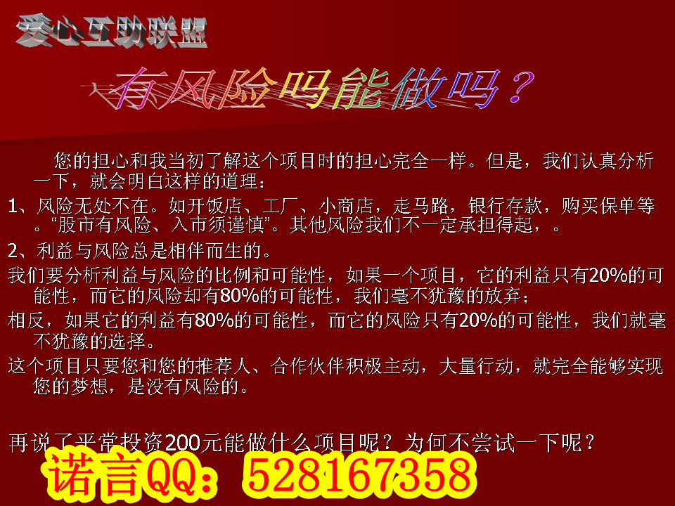 如果你是做網(wǎng)絡(luò)沒賺錢的,你是做直銷沒賺錢的。你對現(xiàn)在的生活不滿意的,你想改變目前狀況的。一個先進的模式,最大趨勢性的行業(yè)。已經(jīng)來臨嶄新的平臺,成功的起點,搶先一步,領(lǐng)先一路!全新的電子商務(wù)模式,攜手與市場精英共同打造一個嶄新的、穩(wěn)健的電子商務(wù)平臺把握最佳創(chuàng)富時機速度聯(lián)系加QQ:2261495122