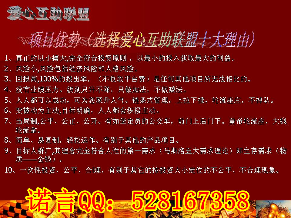 朋友,當(dāng)您打開電腦,瀏覽網(wǎng)頁時,很榮幸您看到了我的帖子,別走開,請您再花一點(diǎn)時間繼續(xù)看下去,因?yàn)楫?dāng)您看完之后會對您今后的未來產(chǎn)生一定影響的時候,難道您還會走開嗎?網(wǎng)上的項(xiàng)目有很多,網(wǎng)上做項(xiàng)目的人也有很多,很多新人不知道怎么選擇網(wǎng)賺項(xiàng)目,其實(shí)剛剛走進(jìn)互聯(lián)網(wǎng),不要著急,不要想著一下子就吃個金胖子,那是不可能的,凡事總有一個過程。前期你需要學(xué)習(xí)的時間會多一些。投資太大的項(xiàng)目風(fēng)險(xiǎn)自然就大,所以,愛心聯(lián)盟最大的風(fēng)險(xiǎn)是200,而這種透明的分配模式,是目前網(wǎng)絡(luò)項(xiàng)目中最先進(jìn)的。出局可賺388440萬。而你只需要一次性投入200元的資金。也許很多人還在納悶,幾十元能變幾十萬,這不太可能吧。那你好好研究一下我們的模式。你會發(fā)現(xiàn)確實(shí)是象我們說的那樣。只要你用心做,堅(jiān)持做,努力發(fā)展,是一定可以做到的,項(xiàng)目咨詢愛心互助創(chuàng)業(yè)聯(lián)盟:人脈、資料、賺錢愛心創(chuàng)業(yè)聯(lián)盟朋友來到這里你即將看到一個非常好的投資理財(cái)計(jì)劃!如今的200元零用錢可以做什么?我們告訴你:將你的200元人民幣變成20萬!您只需要一次性投資200元人民幣!打造:千萬資產(chǎn)和龐大人脈財(cái)富的雙豐收!共創(chuàng)雙贏!回報(bào)大,時間越久,網(wǎng)絡(luò)越深,收入越多,人脈越廣!會員之間直接匯款,不需要等待公司支付!會員直接向您付款,100%現(xiàn)金到賬,平臺不收任何費(fèi)用!方法簡單,不限時間,系統(tǒng)穩(wěn)定持久!3倍倍增,上下互幫,快速擴(kuò)展網(wǎng)絡(luò),能力強(qiáng),速度快,能力弱上面幫,有人就滑落你下面!平臺不收費(fèi),沒有資金沉淀,無風(fēng)險(xiǎn)!沒有每月的服務(wù)費(fèi)也沒有管理費(fèi)!選擇愛心互助聯(lián)盟優(yōu)勢機(jī)會是留給有準(zhǔn)備的人仁者見仁智者見智有人說,成功太難了,成功是少數(shù)人的事,于是因?yàn)楹ε路艞壛穗y得的成功的機(jī)會,一輩子碌碌無為,但是結(jié)果是什么呢,結(jié)果就是一輩子被生活的車輪推著到處走,買菜買衣服喜歡討價還價,出門擠公交一身臭汗,為了還銀行貸款每天拼命打工,幾十年如一日的重復(fù)貧窮的生活.年老時發(fā)現(xiàn)身體健康出問題了,打工一輩子沒有錢花了,孝敬父母不敢說了,孩子長大需要借力的時候幫不上忙了,自己也顧不了自己了,但是一切都晚了,所謂賺錢難,不賺錢更難!如果僅僅因?yàn)楝F(xiàn)在還有一口飯吃就不努力打拼的話,結(jié)果也是可以預(yù)知的!??!一個人成與敗其實(shí)全在自己的掌握當(dāng)中,每個人都掌握著自己的命運(yùn)!我們的互聯(lián)網(wǎng)最佳創(chuàng)業(yè)成功機(jī)會,你把握好了嗎?門檻低,注冊免費(fèi),升一級只需200元,推薦一人就收200!你┌──┐第一層:2人你升級到1級會員A1B1有權(quán)獲得此層會員升級費(fèi)200元=400元┌──┐第二層:4人你升級到2級會員A2B2有權(quán)獲得此層會員升級費(fèi)400元=1600元┌──┐第三層:8人你升級到3級會員A3B3有權(quán)獲得此層會員升級費(fèi)800元=6400元┌──┐第四層:16人你升級到4級會員A4B4有權(quán)獲得此層會員升級費(fèi)1500元=24000元┌──┐第五層:32人你升級到5級會員A5B5有權(quán)獲得此層會員升級費(fèi)3000元=96000元┌──┐第六層:64人你升級到6級會員A6B6有權(quán)獲得此層會員升級費(fèi)4000元=256000元愛心事業(yè),宏圖大展,心想事成!獎勵共收入38萬達(dá)到第五級可享受國內(nèi)免費(fèi)五日游一次達(dá)到第六級可享受會所獎勵現(xiàn)金人民幣一萬元備注;AB區(qū)三代內(nèi){A區(qū)10人,B區(qū)10人},10:10小區(qū)業(yè)績對碰獎100元。檻低,注冊免費(fèi),升一級只需200元,推薦一人就收200!全球網(wǎng)絡(luò)發(fā)展系統(tǒng),每個人都是一個起點(diǎn),公平公正,上下互幫,您不用擔(dān)心收不到錢!愛心創(chuàng)業(yè)聯(lián)盟-是今天網(wǎng)絡(luò)營銷行業(yè)中成長最快、最火爆的平臺之一!通過一流的人性化推廣計(jì)劃,我們所帶來的全球商機(jī)正在掀起最強(qiáng)烈的熱潮。每天幾百人加入!最新模式愛心聯(lián)盟投資200元,住家創(chuàng)業(yè),不要錯過|最新模式愛心聯(lián)盟投資200元,住家創(chuàng)業(yè),不要錯過|這是一個百年不遇的財(cái)富機(jī)會,關(guān)于財(cái)富,唯有用我們自己的眼光去發(fā)現(xiàn),并能及時的抓住才會變成自己的財(cái)富,不愿嘗試,就會與財(cái)富無緣,猶豫不決,只會錯失商機(jī),抱恨終身。這是一張智慧與愚蠢的廣告,智者一看就知道是百萬大鈔,蠢者怎么看都是一條信息!抓住的叫機(jī)會,錯過了是故事,膽魄成就夢想,自信成就一生讓猜疑的人繼續(xù)猜疑,讓清高的人繼續(xù)清高,讓觀望的人錯失良機(jī),讓等待的人永無機(jī)會,讓相信的人去尋找夢想,讓執(zhí)著的人挖掘?qū)毑?強(qiáng)者把握機(jī)會;弱者等待機(jī)會;自以為是者放棄機(jī)會。財(cái)富就在你一念之間!注冊咨詢市場開拓導(dǎo)師:★云龍★qq2532925207★注冊咨詢市場開拓導(dǎo)師:★云龍★2532925207★★★★云龍5號QQ:2532925207★★★★★★風(fēng)絕QQ:290965855★★★★★★水易QQ:859344431★★★★★★大眾QQ:2585293008★★★★★★