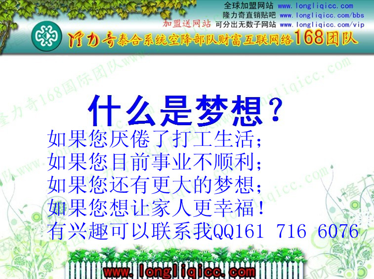 馬風(fēng)英 聯(lián)系方式QQ:1617166076電話(huà):15866408645 .隆力奇直銷(xiāo)創(chuàng)業(yè)導(dǎo)師,資深顧問(wèn),網(wǎng)商教練!隆力奇直銷(xiāo)空降部隊(duì)168國(guó)際團(tuán)隊(duì)創(chuàng)始人、資深直銷(xiāo)實(shí)戰(zhàn)專(zhuān)家,高級(jí)培訓(xùn)導(dǎo)師。擅長(zhǎng)于直銷(xiāo)團(tuán)隊(duì)建立、人才培養(yǎng)與系統(tǒng)打造。尋找敢于挑戰(zhàn)高薪的住家創(chuàng)業(yè)精英!我們一起全力以赴,我來(lái)手把手教會(huì)你互聯(lián)網(wǎng)輕松創(chuàng)業(yè)做網(wǎng)商!