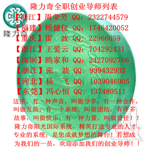 隆力奇陽(yáng)光系統(tǒng)全職創(chuàng)業(yè)教練:周榮芳QQ2322744579 人生格言:相信自己 永不言??!