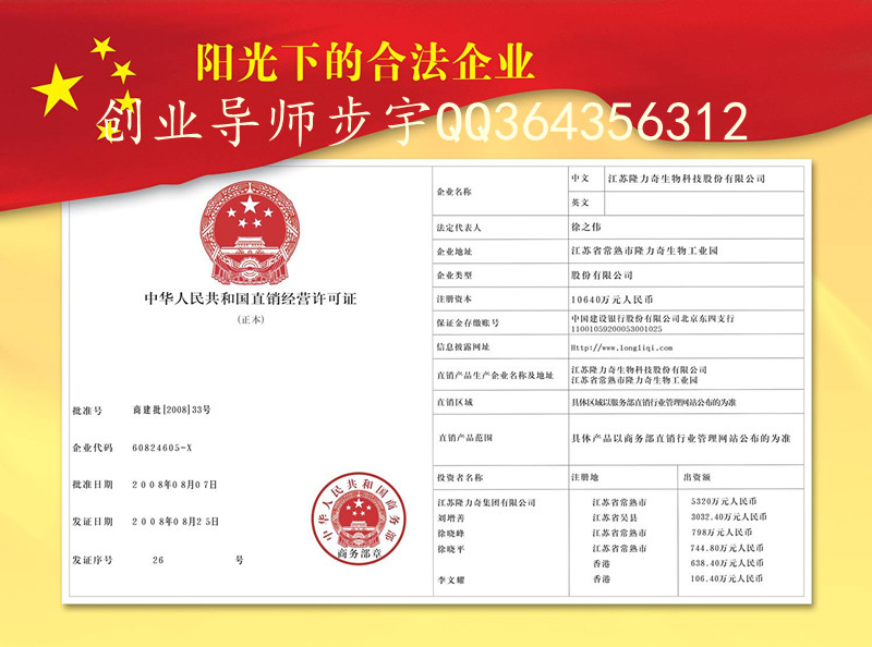 隆力奇有商務(wù)部頒發(fā)的直銷牌照,是中國(guó)合法的第二十四家直銷公司,隆力奇公司從創(chuàng)辦,到如今中國(guó)日化第一品牌,歷經(jīng)了二十六年時(shí)間,對(duì)于企業(yè)的產(chǎn)品研發(fā),市場(chǎng)的銷售,企業(yè)的知名度在中國(guó)有著家喻戶曉的影響力。直銷每年向外流量非常大,巨額的資金流失,而中國(guó)自己的直銷企業(yè)也要成長(zhǎng),打鐵還需自身硬,所以想避免資金流失,就必須發(fā)展民族自己的直銷企業(yè),而隆力奇從合法拿牌,到啟動(dòng)全球發(fā)展計(jì)劃,無(wú)疑國(guó)家會(huì)大力支持,讓民族企業(yè)成長(zhǎng)起來(lái),走出國(guó)門,邁向世界。