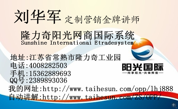 隆力奇陽(yáng)光國(guó)際創(chuàng)業(yè)導(dǎo)師劉華軍老師 手機(jī):15362889693 QQ:2389893036