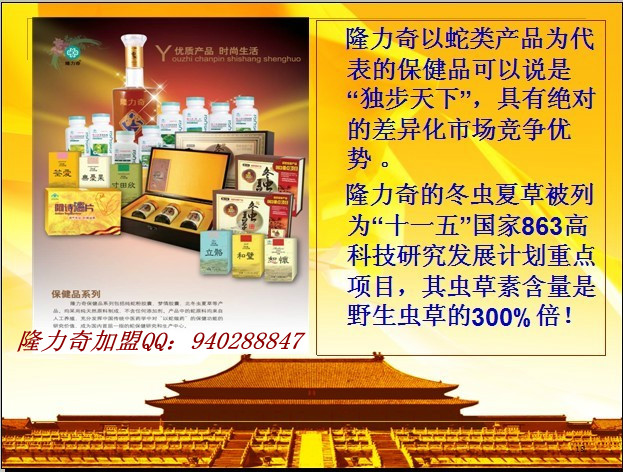 江蘇隆力奇目前九大系列產(chǎn)品系列包括:1蛇保健產(chǎn)品系列、2冬蟲夏草、3保和堂食用菌系列、4生食系列、5生活實用高功效功能保健品系列(阿詩洛、保健茶系列、意守足泡浴粉系列等)、6保健理療器械系列(精致生活活能π水杯、子午流柱低頻治療儀等)、7對標(biāo)雅詩蘭黛的美容護膚雅研系列、8對標(biāo)寶潔的個人護理系列和9家居清潔系列。