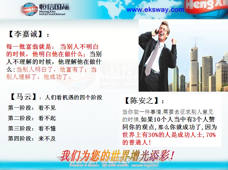 E科士威(ecosway)的老總,精力旺盛,思維敏捷,獨到的眼光,獨到的思維,獨到的商業(yè)模式,使E科士威(ecosway)就這樣穩(wěn)健的做到了一個上市公司。我們也可以想一下,E科士威(ecosway)在馬來西亞那樣競爭激烈的國家做到第一,那么在中國它也可以做到第一,安利用了十年多的時間做到了兩百個億,那么科用3~5年的時間也可以做到400-800個億,因為它在倍增,上千個億也可以做到,那么全世界無限倍增將是更多!我們可以算一下,一天一分錢一個月就是一千萬,一元錢一個月就是十個億,如果賺的多你不能倍增,還能持續(xù)賺取利潤嗎?直銷的魅力就在于倍增,不能倍增就不能成功。A公司鉆石毅然決然放棄一個月2~3萬的收入來做E科士威(ecosway)的原因,就是E科士威(ecosway)可以實在的快速的倍增,業(yè)績穩(wěn)步攀升,丟掉3萬,換取更大的空間,贏得更多財富機會,這也是一個人的眼光及與眾不同之處。