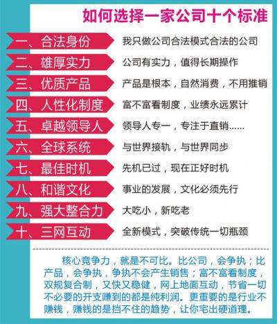 挑戰(zhàn)自我-超越夢(mèng)想:一臺(tái)電腦、一杯咖啡、談笑間成交全球生意! 不出差、不囤貨、不電話邀約跟進(jìn)..盡顯做網(wǎng)商的高貴和優(yōu)雅! 拿牌公司、專業(yè)系統(tǒng)、網(wǎng)商教練、隨時(shí)得到系統(tǒng)老師支持與協(xié)助! 網(wǎng)上開發(fā)、網(wǎng)上培訓(xùn)、一次定位、永不歸零...無后續(xù)培訓(xùn)及運(yùn)作費(fèi)用!歡迎真誠交流QQ:243747171!