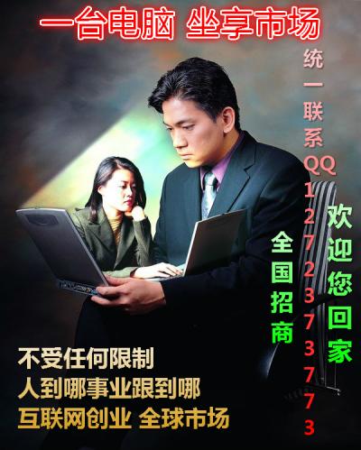 互聯(lián)網(wǎng)直銷使普通人由平凡而璀璨,由約束而自由,由卑微而顯貴。今天有些人還沒有來得及從這個(gè)直銷的噩夢中驚醒,而新的一場革命像海嘯一樣又鋪天蓋地而來!機(jī)會(huì),是留給懂得把握的人;成功,是留給懂得付出的人;財(cái)富,是留給懂得追求的人!機(jī)會(huì),人的一生中不會(huì)有幾次,許多人都為與機(jī)會(huì)擦肩而過而后悔,請不要再丟掉這次機(jī)會(huì)。網(wǎng)商系統(tǒng)核心領(lǐng)導(dǎo)人業(yè)務(wù)QQ:1272373773招商熱線:13751105689做對趨勢,把握[詳細(xì)]